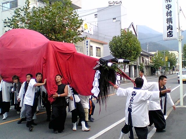 しかし先ほどと違って半被姿の若い衆が交通規制を行っている.