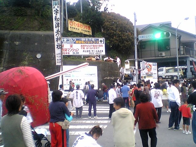 やっぱり牛鬼だった.牛鬼の祭りって今の時期なのか?と思ったので,近くにいた半被をきた人に聞いてみる.宇和津彦神社の秋祭りというやつで,牛鬼以外にもお神輿が出たり,踊りの奉納があるらしい.