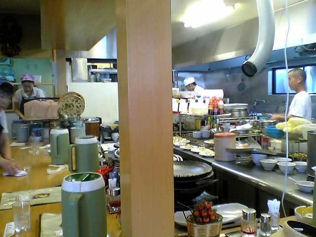 この写真だと厨房で働いているのは2人しかいないように見えるが,実際には常時4人くらいが料理を作っており,その合間をホール担当の女性数名が動き回って料理を運んだり,皿の準備をしたりしている.