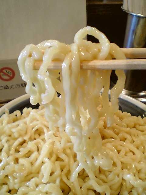 割り箸の太さと比較してもらえれば分かるだろうが,かなりの太さの縮れ麺.