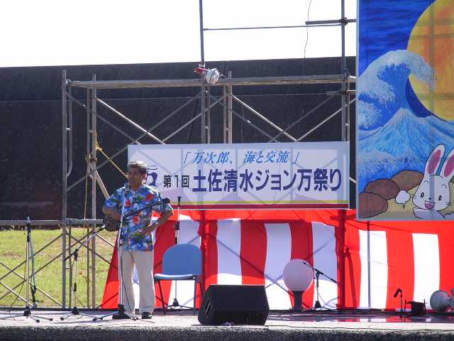 で,土佐清水市まで戻ってきたのだが,せっかく土佐清水に来たんだから,カツオの酒盗でもお土産に買って帰りたいものだ.どこかに店はないかな?と探していると,第1回土佐清水ジョン万祭りなるものが海の駅あしずりで開催されているとの看板があった.それは行ってみねばなるまい.