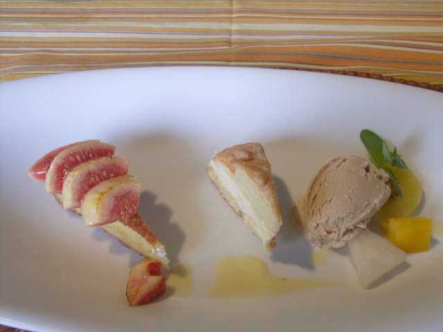 右から,黒コショウのアイスクリーム,カスタードケーキ,イチジクのタルト.