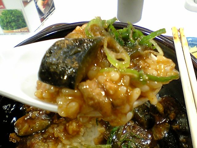 あれ,牛丼部分が全然入ってないぞ? これって麻婆茄子牛丼じゃなくて,単なる麻婆茄子丼なのでは...