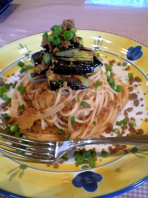 「なすとひき肉の」パスタというので,ミートソースに茄子が混じっているものを想像していたのだが,全然違っていた.