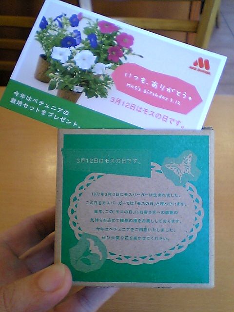 ということで,毎年3月12日はモスの日になっており,この日に店舗に行くと,先着順で花の栽培キットをもらえる.