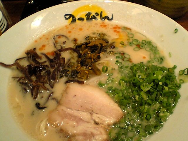 チャーシューにネギ,辛子高菜が白濁したスープの上に浮かんでいるという見た目は,まったく普通の豚骨ラーメンだ.ちょっと違うのは,ラー油っぽいのが浮いていることくらいか.