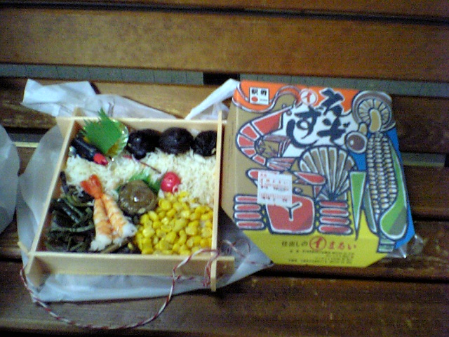なんとか駅弁を買うことには成功したので,駅のホームでつましく夕食(えぞ寿司 660円).