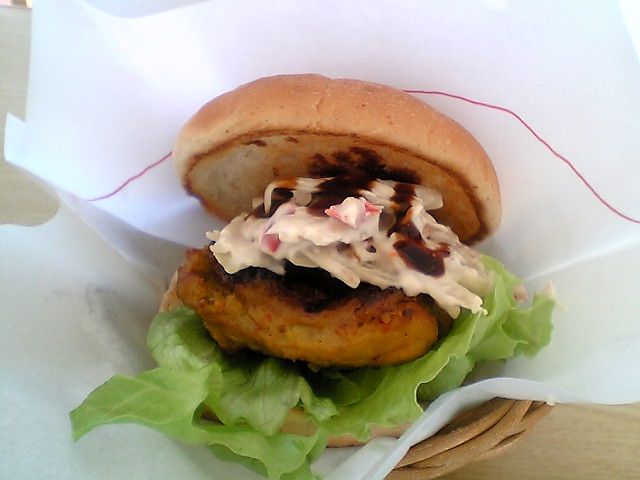 続いてマスタードチキンバーガー.これも正式名称は「根菜サラダとプラムソースがけ マスタードチキンバーガー」なのだとか.メニューの名前を長くするのはモスバーガーの最近の流行なのか?