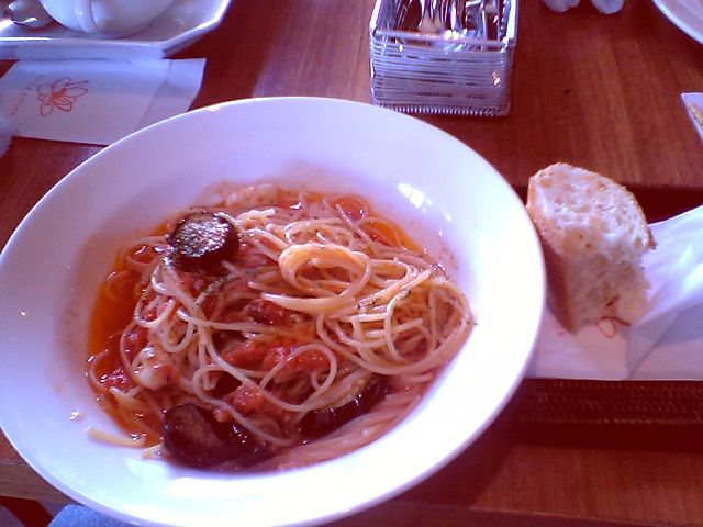 今回はナスとカマンベールのトマトソース.普段食べているトマトソースのパスタに比べるとえらく油っぽかった.カマンベールから溶け出したんだろうか.最初は面食らったが,途中からは慣れてきて,それなりに美味しくいただけた.