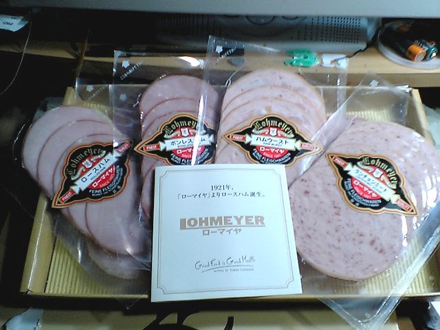公式発表では3000円相当の自社製品とのことなのだが,ロースハム,ボンレスハム,ランチョンミート,ハムウースト(Ham Wurst;Wurstはドイツ語でソーセージのこと)の4種類がそれぞれ2パックずつ入っていた.