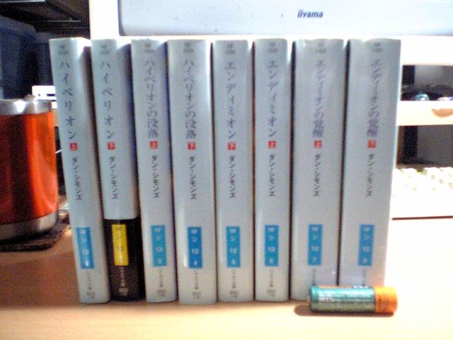 前作の『エンディミオン 上・下』と比べて1.5倍近くのページ数になっており,その分厚さはついに比較対象である単三電池を抜かしてしまった.
