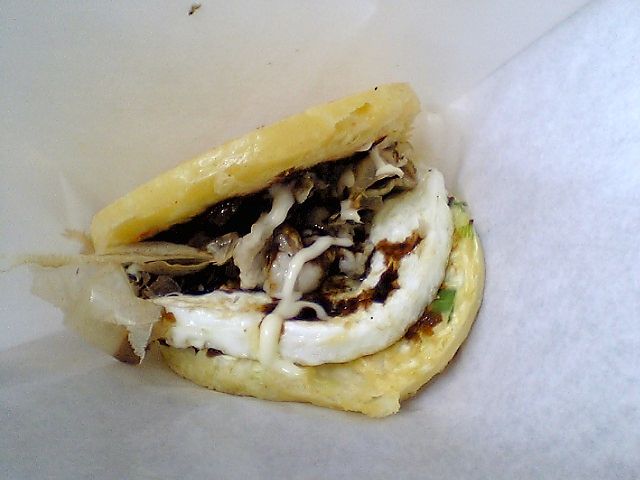 見た目はモスバーガーのライスバーガーのバンズをお好み焼きにした感じ.想像していたよりも小さかったのだが,単品(今回は豚玉)で220円だから,こんなものか.