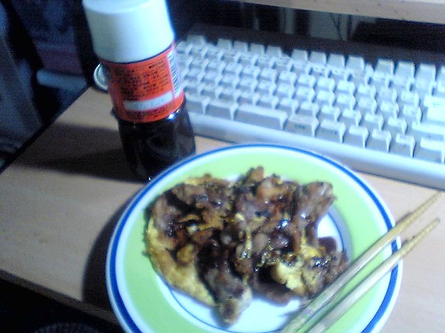 今から夕食というのも変な話なので,とりあえず豚肉だけ食べてしまうことに.珍しく卵があったので,豚平焼きモドキでも作ろう.