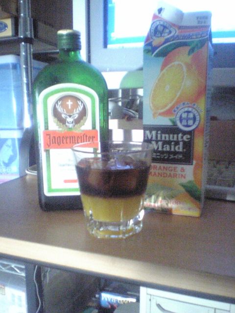 ちょっと逆光ぎみで写りが悪いが,オレンジジュースの橙色の上にイエーガーマイスターの黒が層になって浮かんでいるのが分かるだろうか?