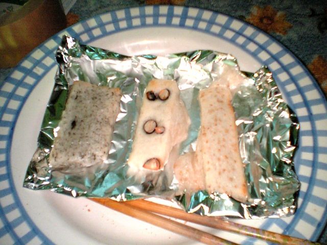 先日,ある方から実家で作ったという餅,「かき餅」をいただいた(左から青海苔,豆,胡麻).