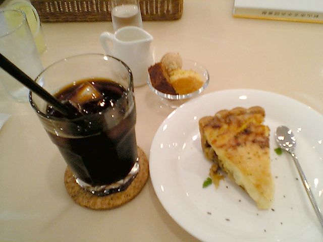 途中,店員さんが突き出しのプチケーキを持ってきてくれたりもしたが,できるだけ挙動不審に見られないように気をつけつつ,待つことしばし.キッシュとドリンク(今回はアイスコーヒー)が到着.