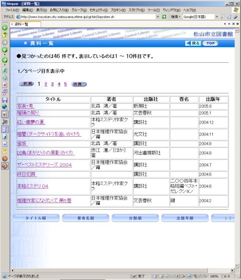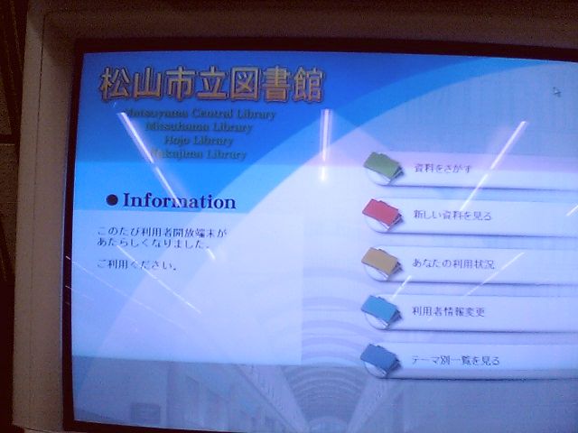 なお,北条市および中島町と松山市の合併によって,それぞれの図書館も松山市立の図書館になったわけだが,今回の新システムでそれらの図書館が一つに結ばれ,北条や中島町の蔵書も検索できるようになるらしい.