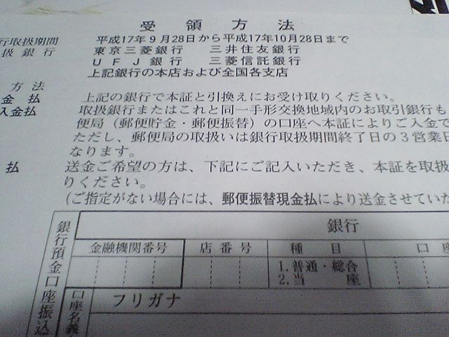 ここで冒頭の画像になるのだが,東京三菱銀行,三井住友銀行,UFJ銀行,三菱信託銀行が取扱銀行になっているので,これらの銀行の窓口に持っていけば換金してくれる.