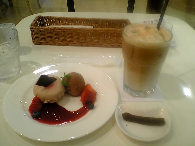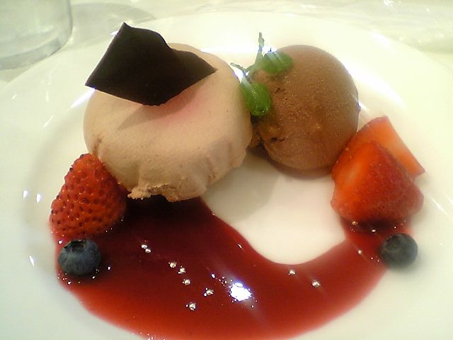 うーん,不思議な味だなあ.でも,付け合せのチョコレートアイスを別にすると,甘さ控えめ&スポンジ部分がないので,ケーキを食べた感がちょっとしない.思わず別のケーキを頼みそうになったが,なんとか踏みとどまった.