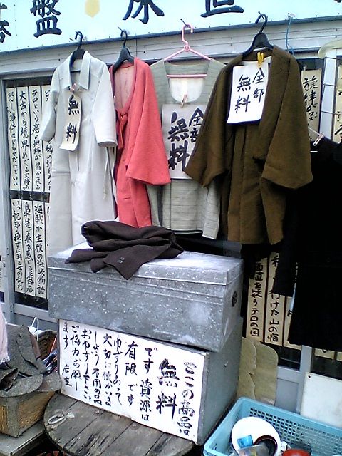 表に出ている商品は無料.窓ガラス一面には世情を描いた俳句らしきものが貼られている.全てを確認したわけではないが,プロ野球改革の話などもあったので,状況に応じて貼り替えられているのだろう.さすがに中に入る勇気はなかったので,そのまま通り過ぎることに.