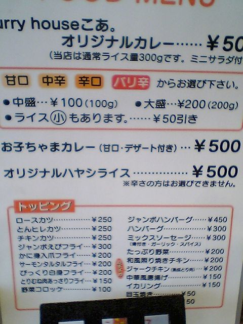今回は開店記念の100円カレーということで選べなかったが,50円の目玉焼きからはじまって,野菜コロッケ(100円),ロースカツ(250円),ミックスソーセージ(300円),ジャンボハンバーグ(450円)などなど,かなり豊富な選択肢が用意されている.