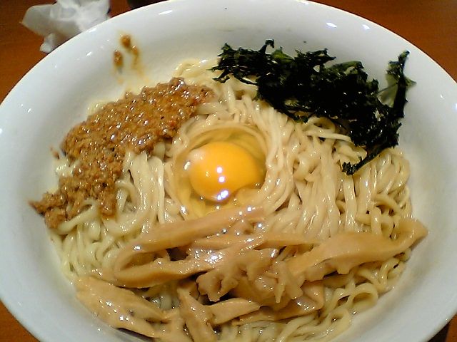 うーん,ひき肉はピリ辛,麺にかかっているタレは醤油ベース(?)で,これらが混ざって美味しいことは美味しいのだが,生卵の白身が多いためか,ちょっとまろやかになりすぎている気がする.