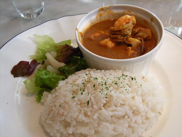 今回のカレーフェアは具の種類に応じて「だし」も変えているそうで,シーフードカレーはフュメ・ド・ポワッソン(洋風魚介のだし)を使っているという.しかし,フュメ・ド・ポワッソンの味なんて知らないし,それよりもスパイスの辛さが前面に出ていて辛い.