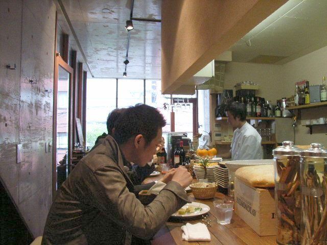 店内はこんな感じ.コンクリート打ちっぱなしの壁のわりに,それほど冷たい印象を受けないのは要所要所に木を使っているためか.カウンターだけを見ると,食器や食材が適度に雑然と並べられていて温かみを感じるくらいだ.