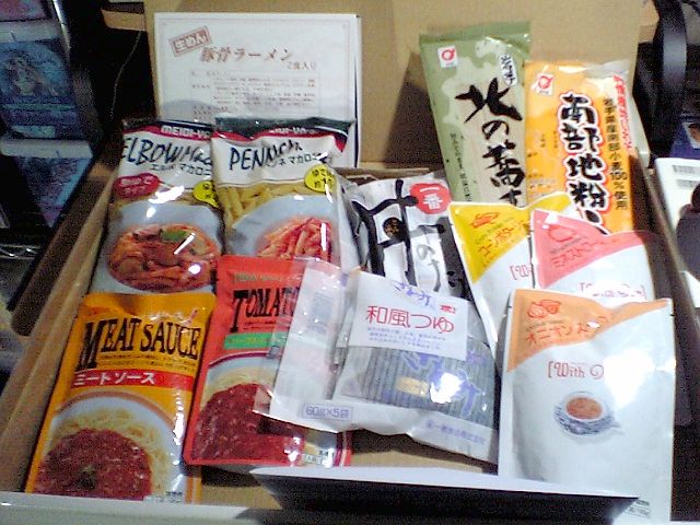 今回の内容は,ラーメン2人前,スープ3種類,パスタ&パスタソース2種類,うどんと蕎麦,和風つゆのパック5袋,そして丼のタレ5袋.