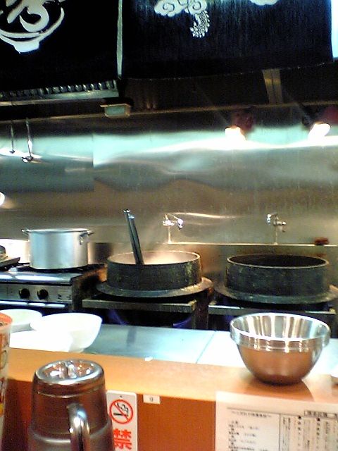 かまどでご飯を炊くときに使うような羽釜が二つ並んでいるが,これはスープ用の釜.入るまで知らなかったのだが,この店はこの羽釜で作った濃厚なスープがウリらしい.