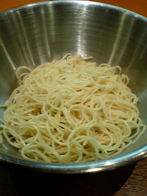 替え玉を入れたところ.替え玉のある店で替え玉を注文するたびに思うのだが,やっぱり替え玉の方が最初に出てきた麺よりも量が多いように思える.