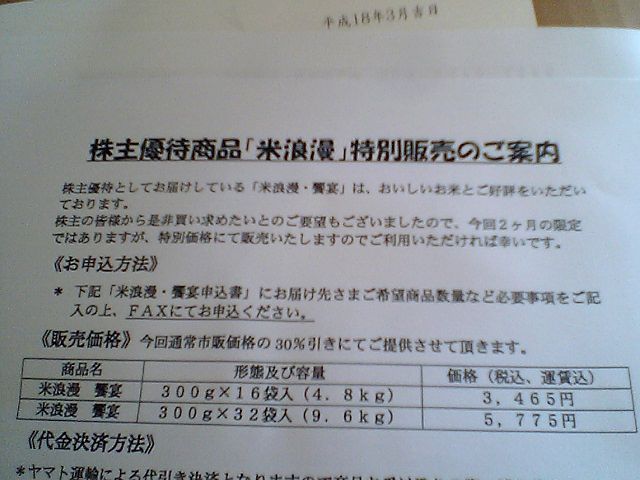 せっかくもらったお米なのだが,そういう事情なので,味はよく分からない.しかし,どうやら好評なようで,今回は通信販売のお知らせが同封されていた.