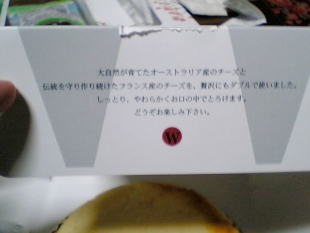 想像以上にチーズ感が強かったのだが,パッケージに書いてる「しっとり」についてはうなずけるものの,「やわらかくお口の中でとろけます」についてはどうだろう? 表面はともかく,中身は柔らかいけど,とろけるとまではいかなかった.ちょっと冷蔵庫に入れすぎたせいかなあ.