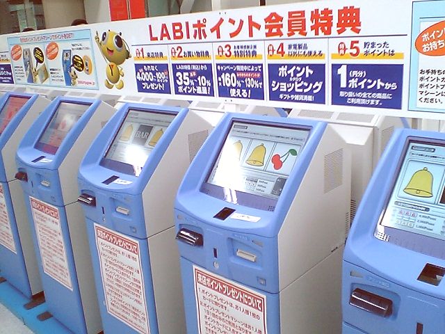 ヤマダ電機には他の家電量販店と同様,YAMADAポイントというポイントシステムがあるのだが,その一つに来店ポイントというのがある.買い物をしなくても来店するだけでポイントがもらえるのだが(回数制限はあるが),このLABI1にもそのシステムがあって,そのための機械がずらっと並んでいた.この裏側にも同じようにずらっと並んでいるので,ここだけで20台近くあるのかな.