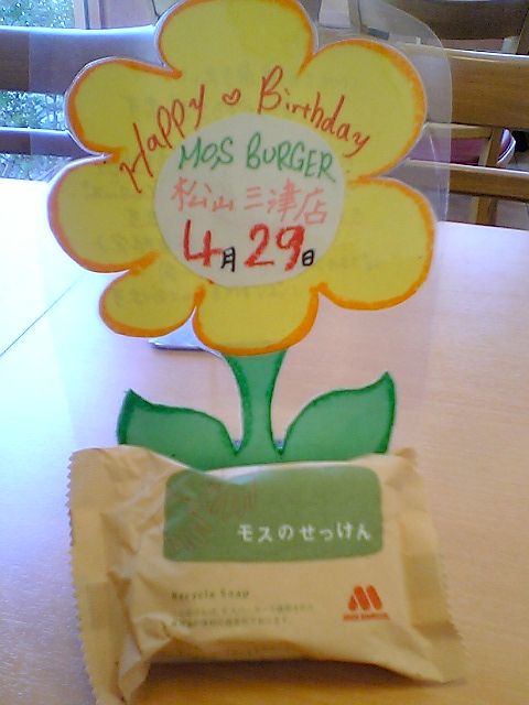 そういえば,モスの新しい期間限定バーガーを食べに行ってないなあと思ってモスバーガーのウェブサイトをチェックしたところ,4/29はみどりの日ということで,リサイクルせっけんがもらえるとあった.これは行くしかないだろう.