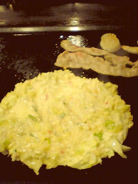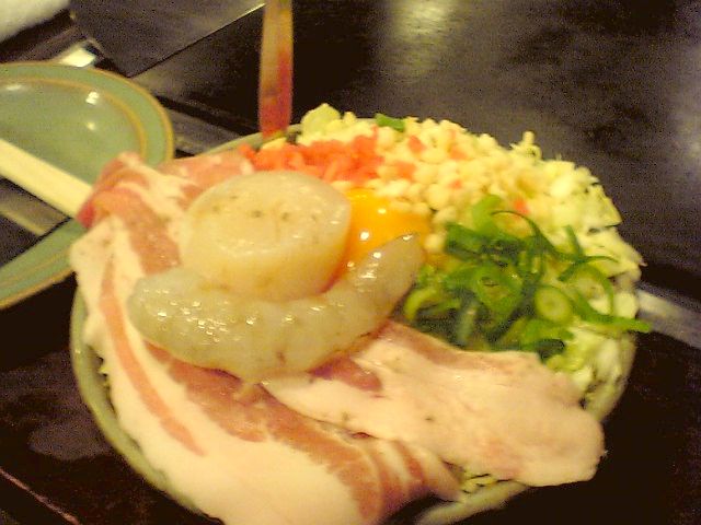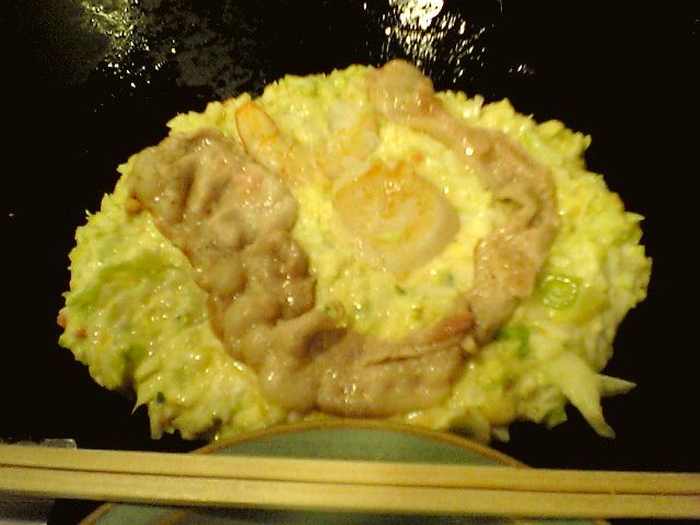 お好み焼きの生地の上に豚の一枚肉,海老,ホタテの貝柱がどーんと載っている.想像以上に具が立派だ.