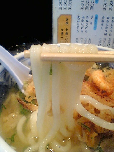 で,食べてみたところ,最初に歯を立てたときの食感がちょっと柔らかめだったので,やしまみたいなタイプのうどん屋さんなのかな,と思ったのだが,もうちょっとかんでみると,かなり歯応えがあった.ネットを検索してみると「もっちり」という表現がされていたのだが,確かにそうとも言えるかも.