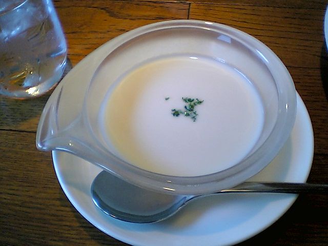いわゆるビシソワーズだが,暑いときに食べると美味しいな.ミキサーがあれば簡単に出来そうだし,今度作ってみようかな.