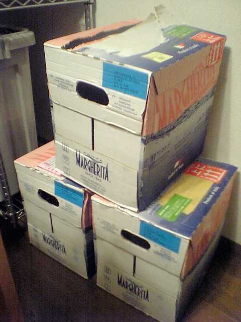 このAZZURRA,1.5リットルのペットボトルを1箱(1ダース入り)単位で注文するわけだが,うちの台所の片隅はこんな感じになっている.