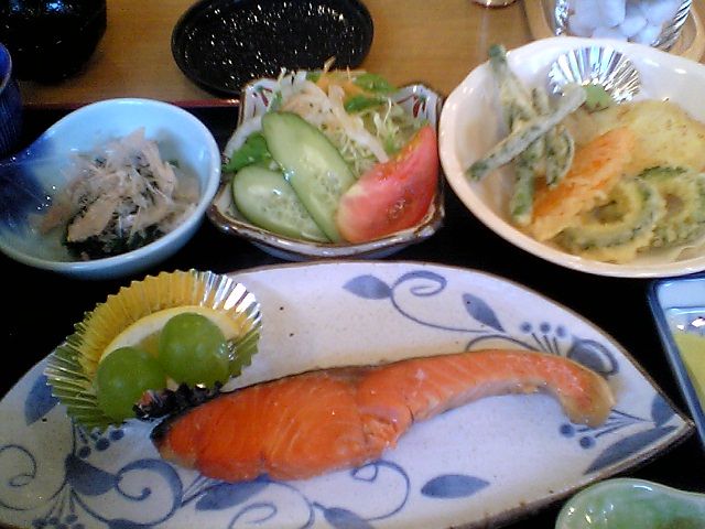 この日の日替わり定食は,塩鮭と野菜の天ぷらに小鉢がいくつか.