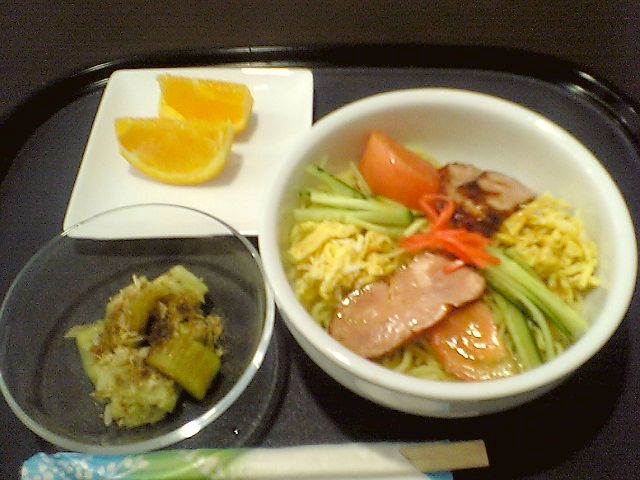 右が冷麺で,左下は焼き茄子,左上はデザート(?)のみかん.