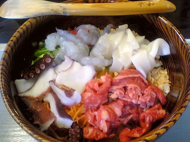 平和焼きの具は牛肉,海老,イカ,タコ.