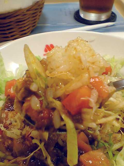 前回食べたのはサンラータンごはんで,これはスープごはんシリーズだったのだが,タコライスはサラダごはんシリーズの一つということで,写真を見て分かるとおり,野菜がいっぱい.というか,ごはんが見えないぞ?