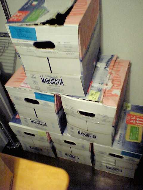 上の3箱は既にカラなのだが,それでも3箱分(1.5リットル×12本×3箱=54リットル)は手付かずで残っている.