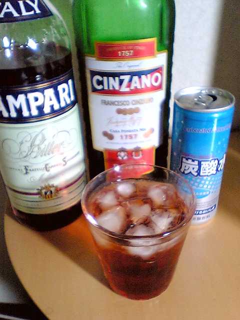 この間読んだ『寂しいマティーニ』に出てきたカクテルで,,カンパリとスイート・ベルモットを1:1で混ぜて,それをソーダで割ったもの.