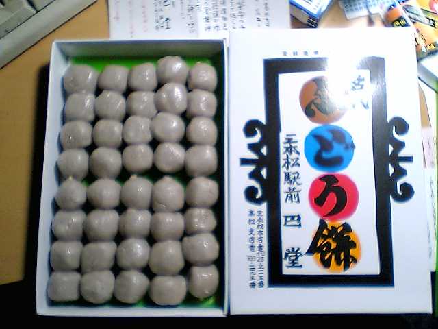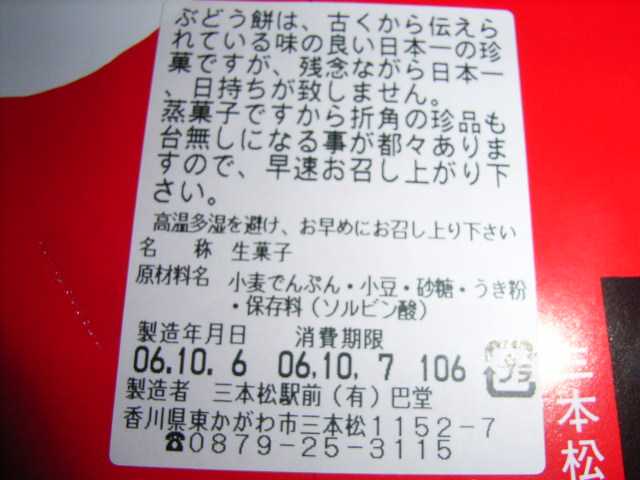 最悪の場合,夜遅くまで営業してそうなマルナカに入ってみるしかないかなあ,などと考えていたところ,「ぶどう餅」なる看板を発見.看板の案内にしたがって,三本松駅の前まで行ってみたところ,