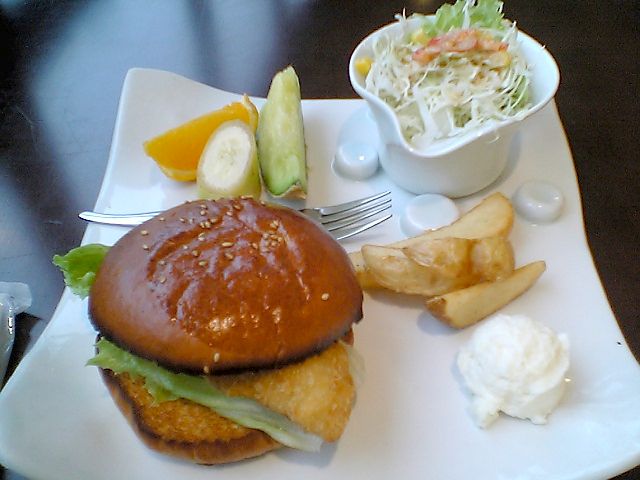 この写真だと,間に挟まれた白身魚のフライがスーパーのお惣菜っぽいが,実際はそんなこともなく,ちゃんとしたフィッシュバーガーだった.サラダやフルーツもついていて,これで100円ならばかなりオトクだと言っていいだろう.