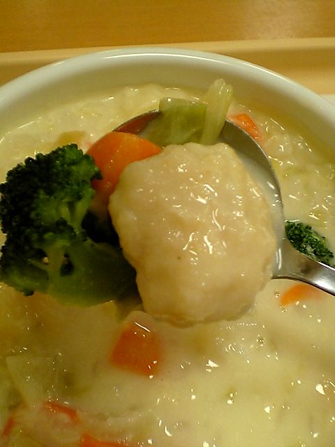 まずは具のほうだが,鶏団子,ブロッコリー,にんじん,キャベツ,じゃがいもが入っていた.