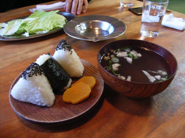 いわゆる「おにぎり」なわけだが,このおむすびを骨付鳥の皿にたまったタレ&肉汁につけて食べるのが美味しいらしい.