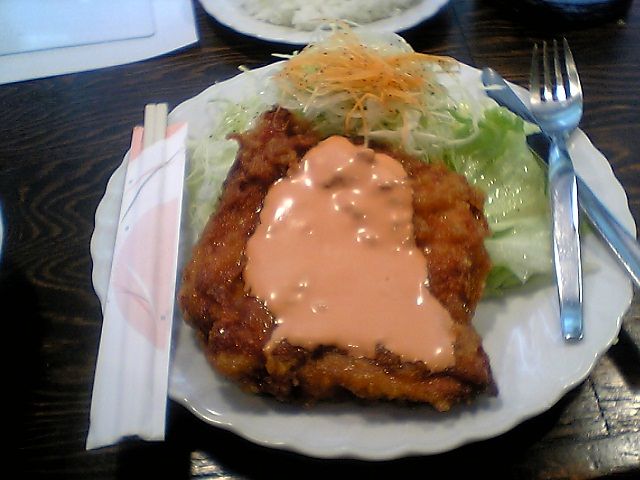 あと,普通のチキン南蛮だと上にかかっているのはタルタルソースなのだが,ここのはいわゆる「オーロラソース」(ケチャップとマヨネーズをまぜたもの)だ.